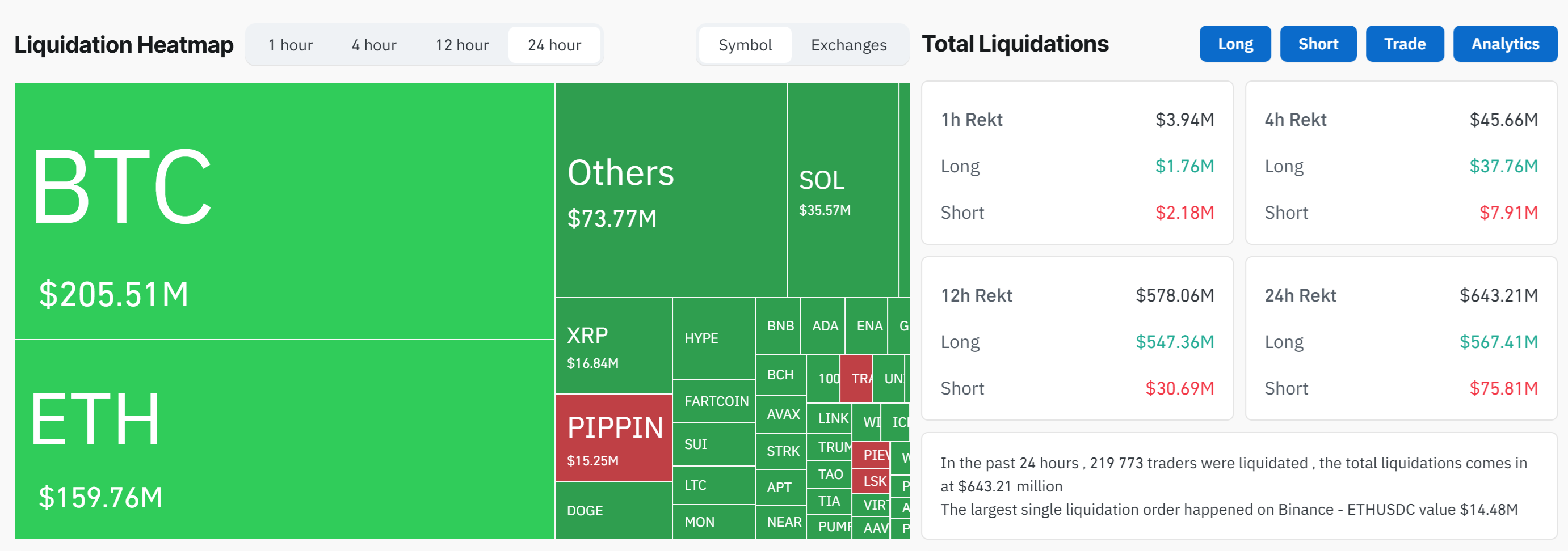 In the past 24 hours, 219,793 traders have been liquidated. Total liquidations amounted to $643.24 million.