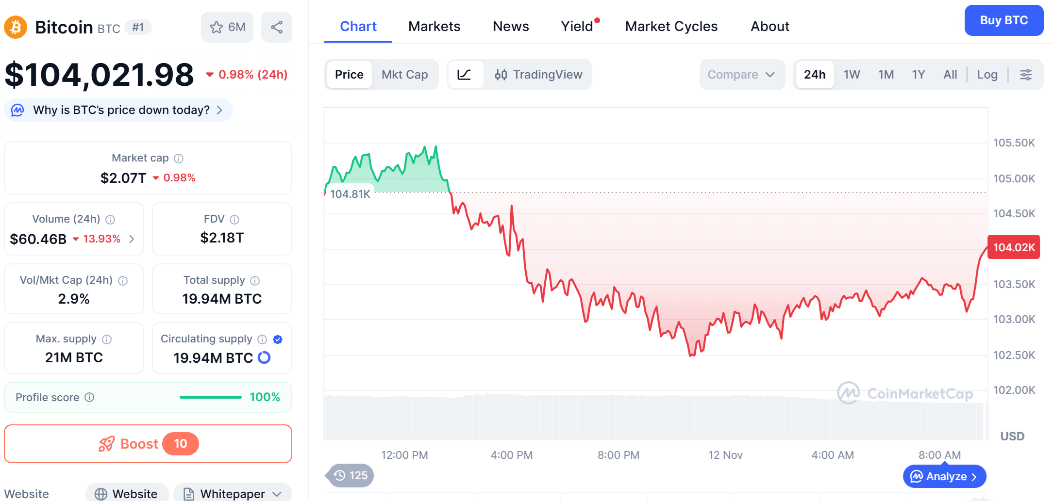 Bitcoin (BTC) is trading near the $103K-$104K mark on Nov. 12. At the press time, according to the data from CoinMarketCap, BTC price is $104,021, which means that it lost 0.98% over the last 24 hours.