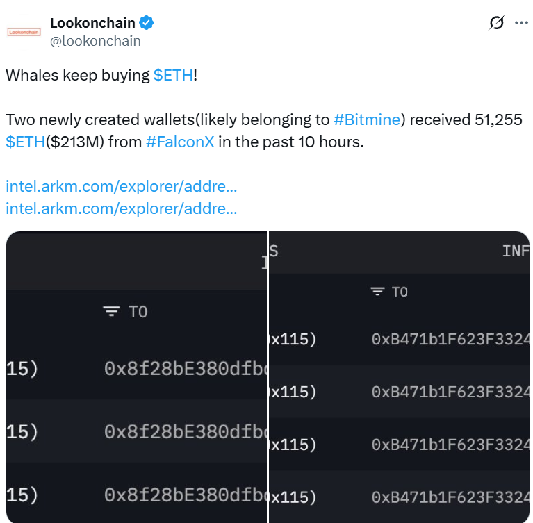 Corporate demand supports Ethereum’s current stability. BitMine, the largest corporate holder of ETH, has continued its buying streak and added approximately 51,255 ETH (valued at roughly $213 million).
