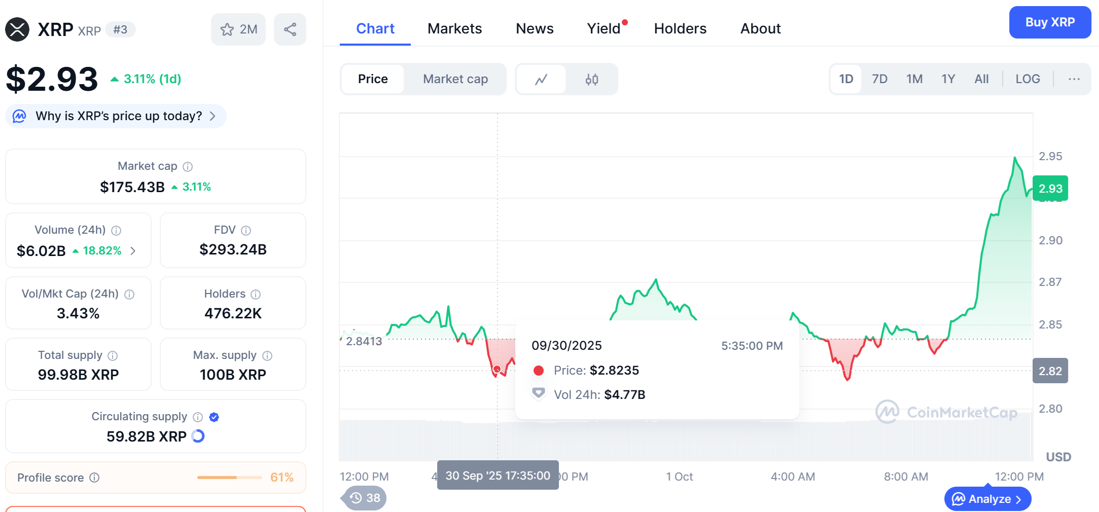XRP is currently trading at $2.93, up 3.11% over the past 24 hours. Trading volume has increased by 18.95%, hitting $6.03 billion.