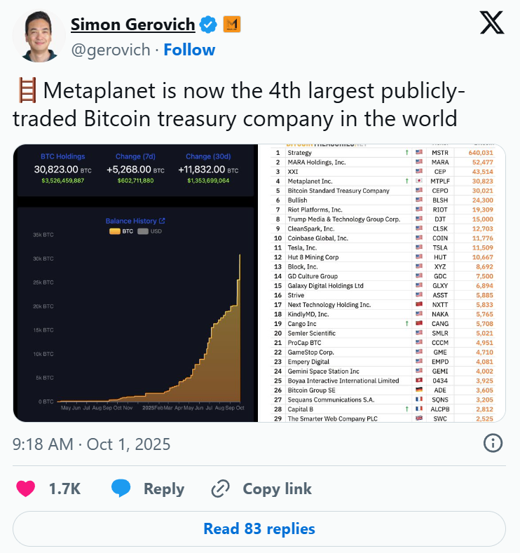 On Oct. 1, Metaplanet, Asia’s leading corporate Bitcoin holder, added another 5,268 BTC to its reserves. The purchase was valued at $615 million, as BTC was acquired at $116,870 per coin.