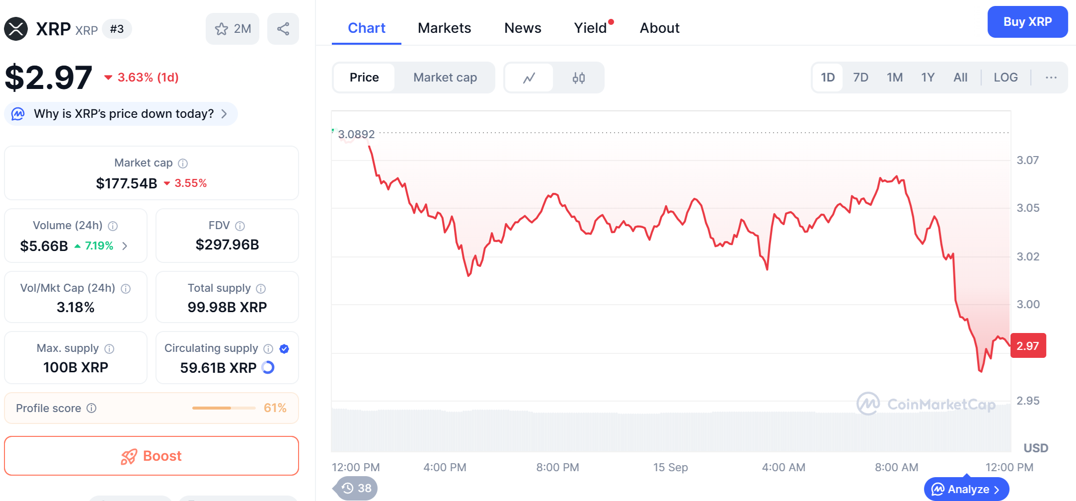 On Sept.13, XRP climbed to a monthly high of $3.18 before easing back to around $3.02.