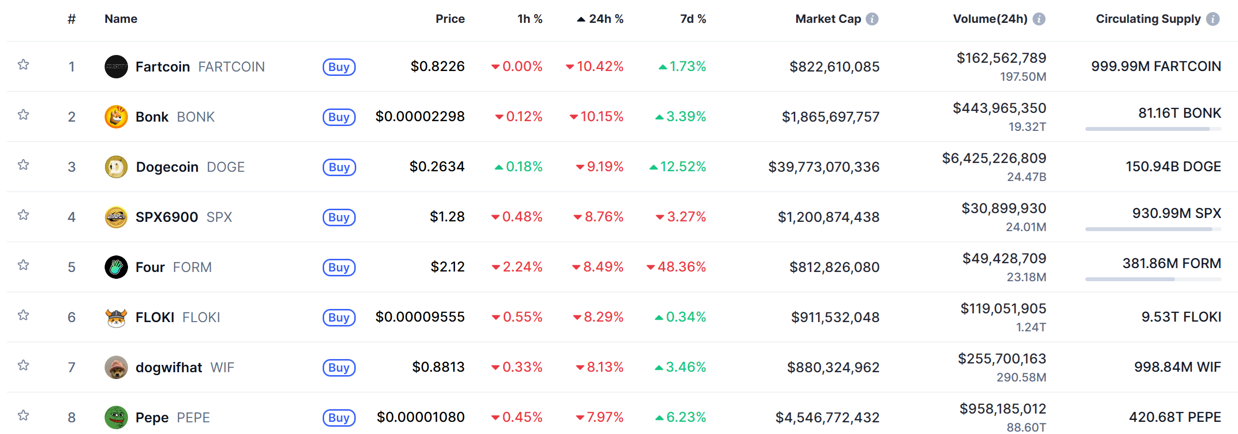 Fartcoin (FARTCOIN), Bonk (BONK), Dogecoin (DOGE), Floki (FLOKI), dogwifhat (WIF), and Pepe (PEPE) are among the biggest losers today, all down between 7% and 11%.