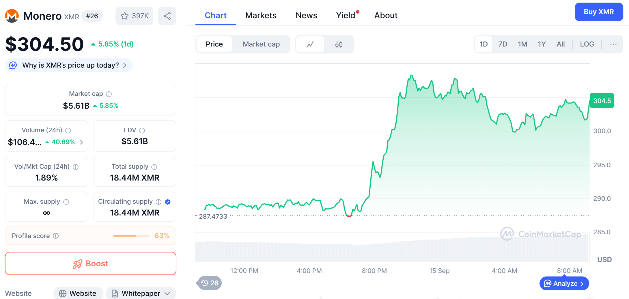 Monero (XMR) is trading at over $300 on Sept. 15, after gaining almost 6% in the last 24 hours.