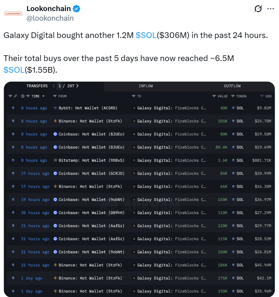 On Sept. 14, Galaxy acquired 1.2 million SOL tokens at an average price of $237.15 across multiple exchanges, later transferring the assets to the custody provider Fireblocks.