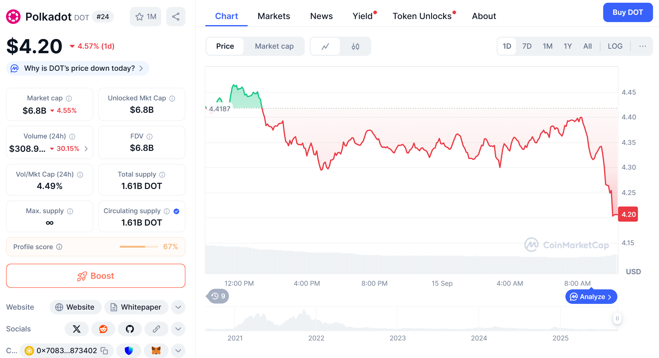 Polkadot (DOT) was trading at $4.196, down 4.7% over the past 24 hours. Despite the dip, the token has posted gains of 4.95% in the last week and 6.22% over the past month.