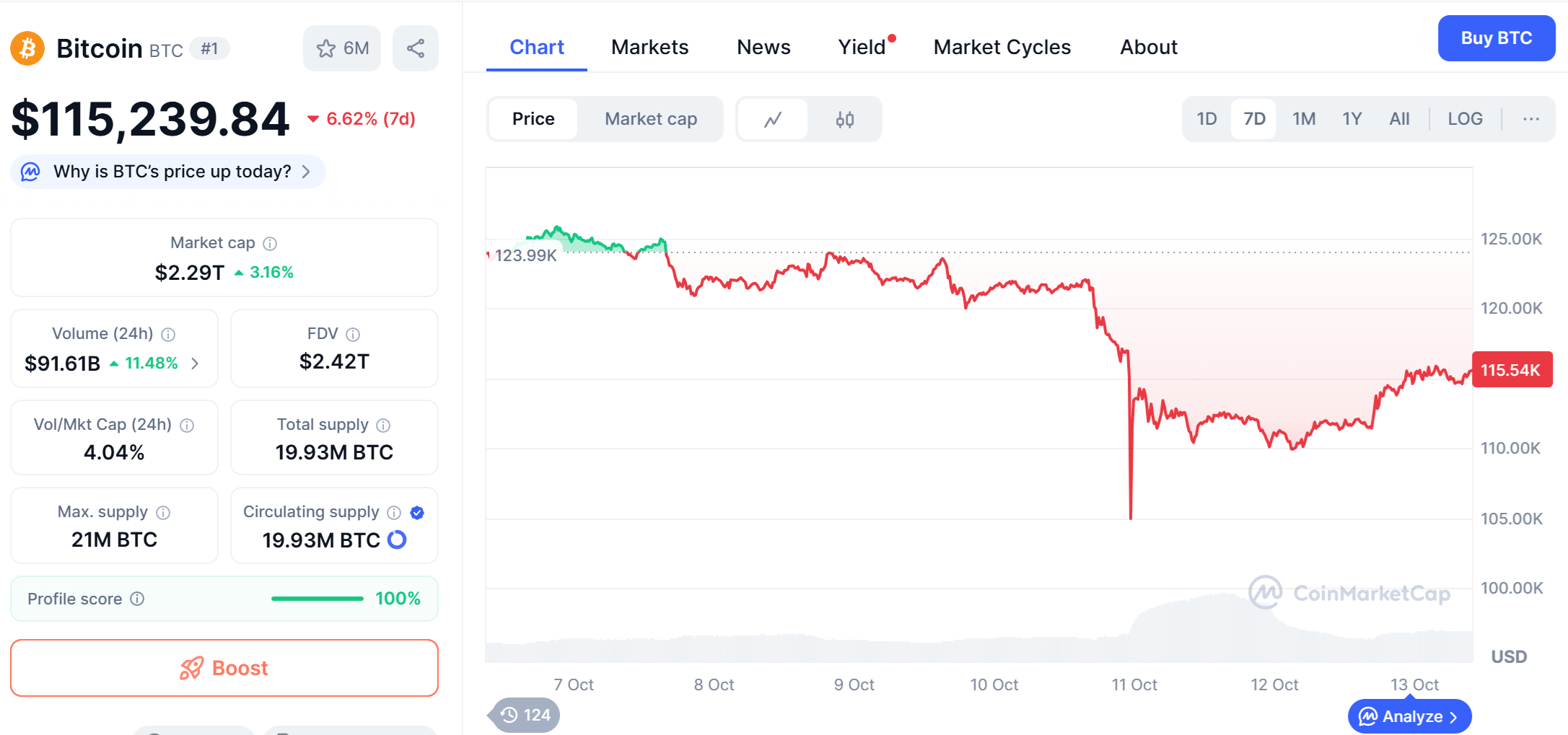 Bitcoin (BTC) rebounded above the $115,000 resistance level on Oct. 13 after dropping nearly 15% over the weekend.