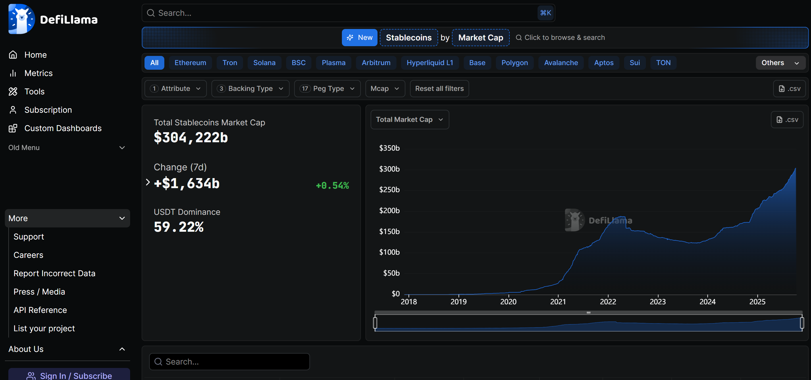 The total stablecoin supply reached a new all-time high of $304 billion as of Oct. 13. This marks a 1% increase over the past week and a nearly 50% rise since January. Total circulation was around $200 billion.
