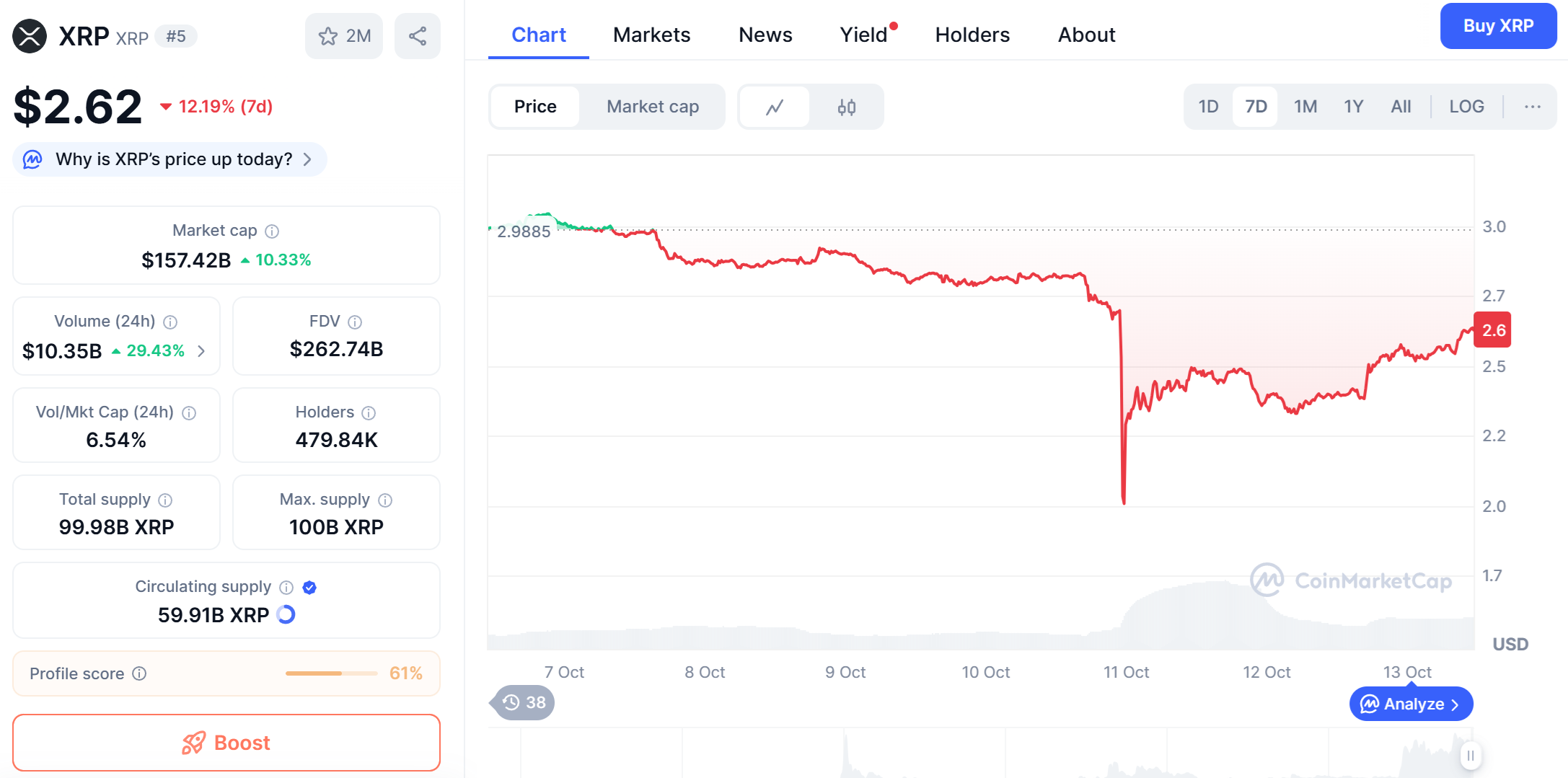 XRP is trading at $2.62, up roughly 10% in the past 24 hours. The gains come as the token continues its recovery following a sharp market-wide sell-off that saw XRP plunge more than 40% to a low of $1.25.