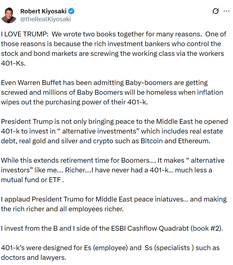 Robert Kiyosaki praised Trump’s decision to allow crypto and alternative assets in 401(k) plans, saying it could enhance Americans’ long-term financial security.