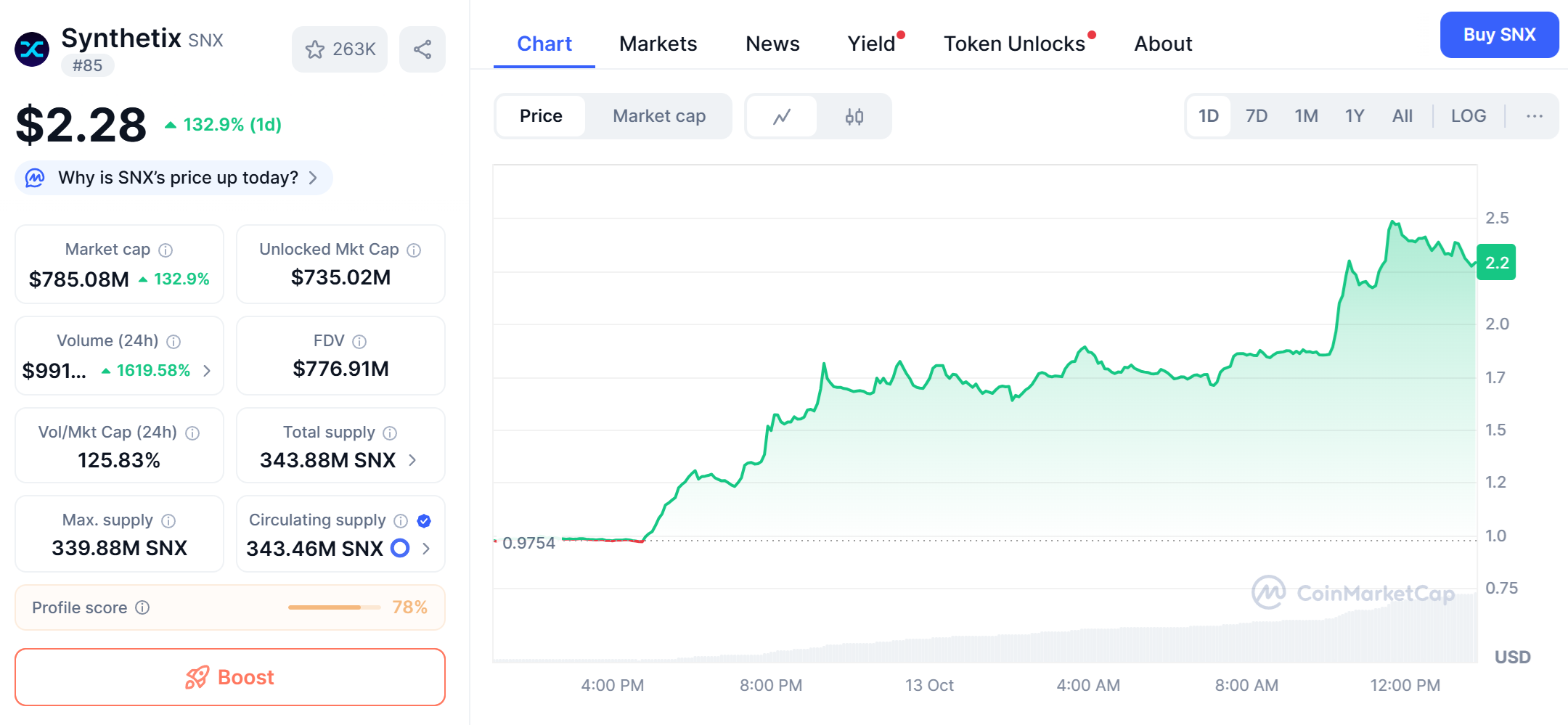 Synthetix (SNX) has gained strong momentum and become the biggest gainer on Oct. 13.