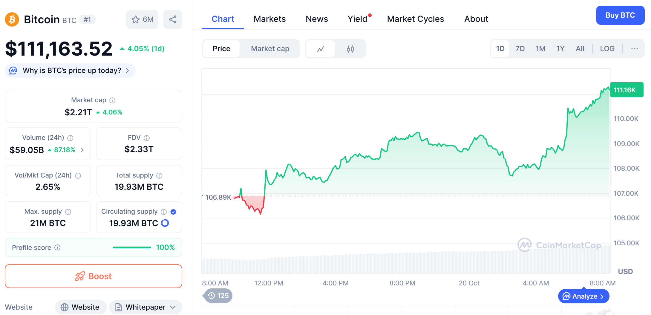 Bitcoin (BTC) has gained over 4% over the past 24 hours and managed to reclaim the $111K level. At the moment, the major coin is trading at $111,163 (+4.05%), which is still significantly lower than $ the $127K reached in September.