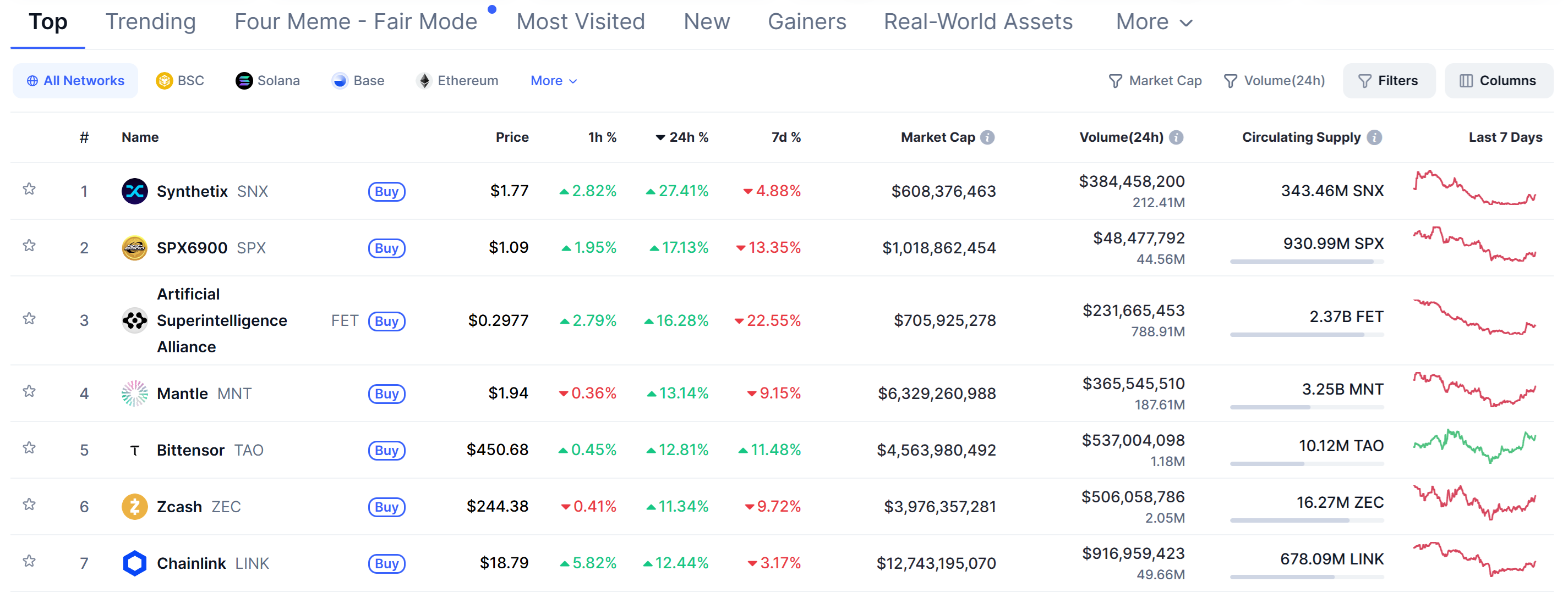 SPX6900 (SPX), Artificial Superintelligence Alliance (FET), Mantle (MNT), Bittensor (TAO), and Chainlink (LINK) are among other coins with the most significant gains over the past 24 hours.