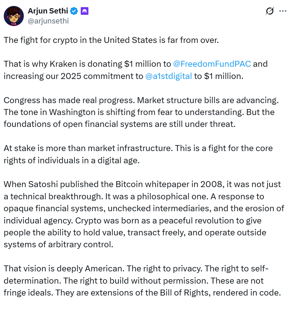 Kraken co-CEO Arjun Sethi has announced a $1 million donation to the Digital Freedom Fund PAC, as well as an increase of the company’s commitment to America First Digital to $1 million.