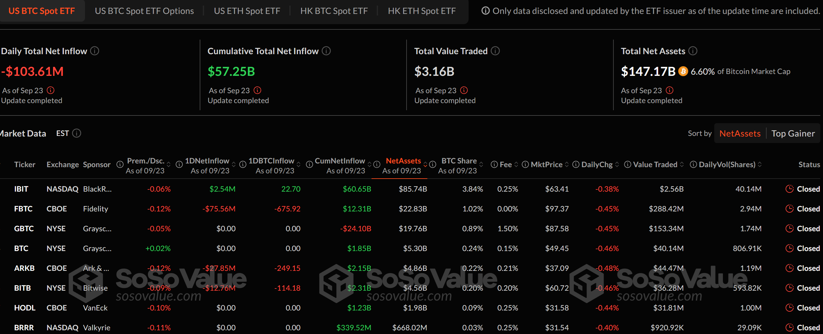 Data from SoSoValue shows that US spot Bitcoin ETFs saw $103.61 million in net outflows on Tuesday, Sept. 23. This marks a second straight day of withdrawals and brings the two-day total to nearly $467 million.
