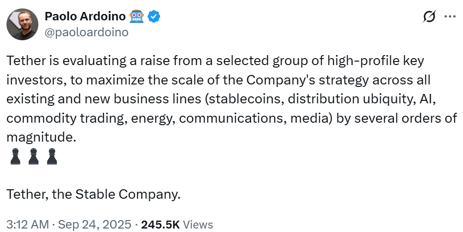Tether is considering a private funding round targeting a select group of high-profile investors to significantly expand its operations across existing and new business lines.