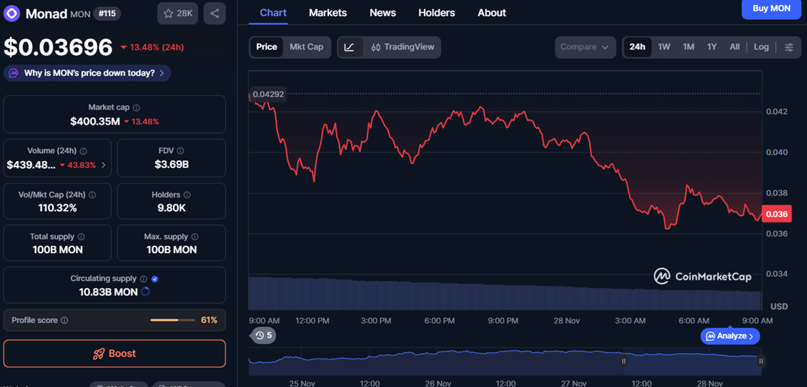 The Monad (MON) token fell 13.48% to $0.03696 in 24 hours, erasing the gains it posted after launching earlier this week.
