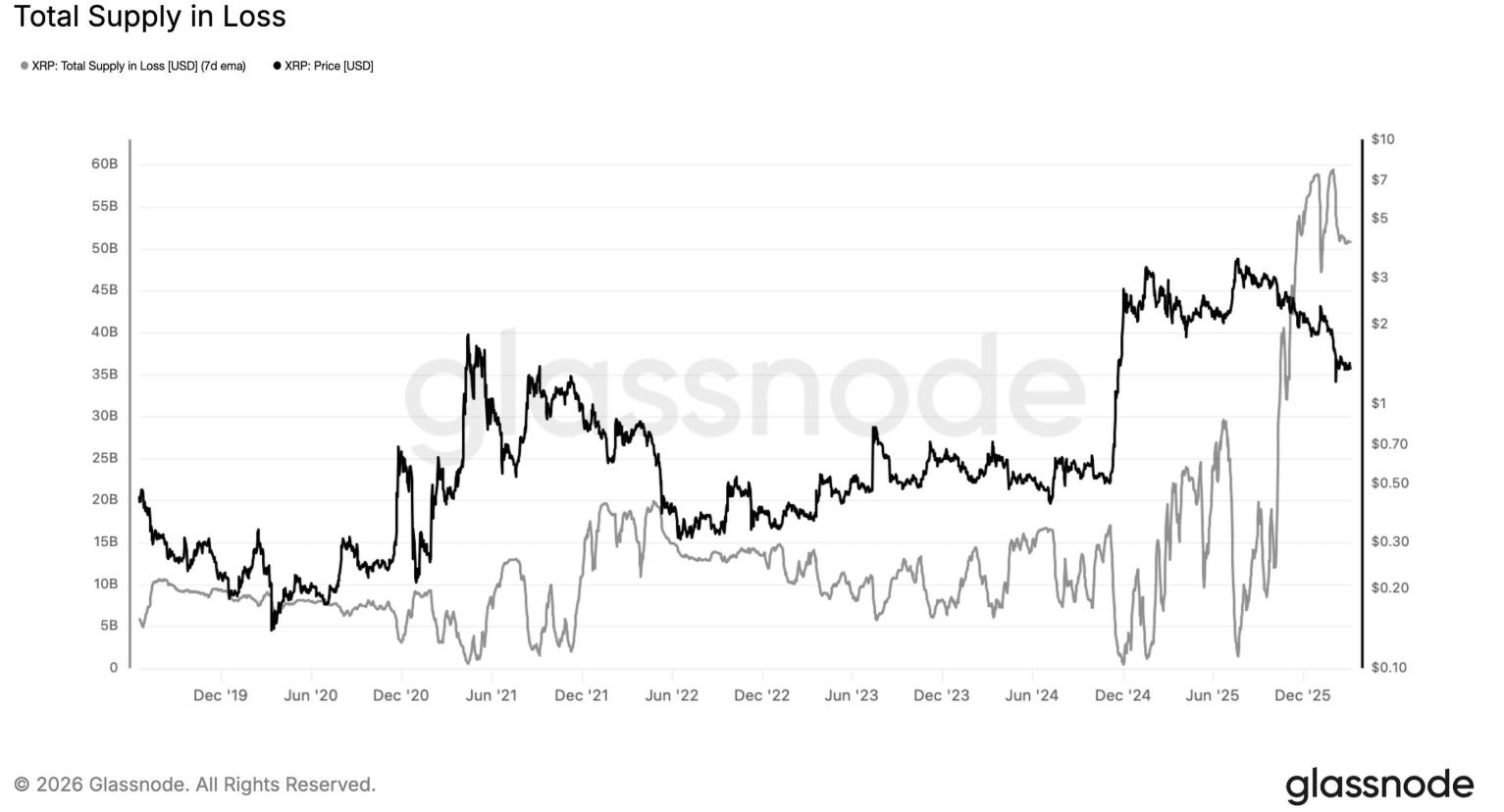 XRP-grafiek toont dat ongeveer 60 procent van de totale circulerende voorraad momenteel op verlies staat. Bron: Glassnode.