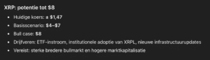 De XRP koers staat op 19 februari 2026 rond $1,47. Dat is ruim 60% onder het record van $3,65 uit juli 2025. ChatGPT schat in dat XRP eind 2026 tussen de $4 en $7 kan staan in een basisscenario. In een bullish scenario noemt het model zelfs $8, wat een stijging van meer dan 440% betekent.