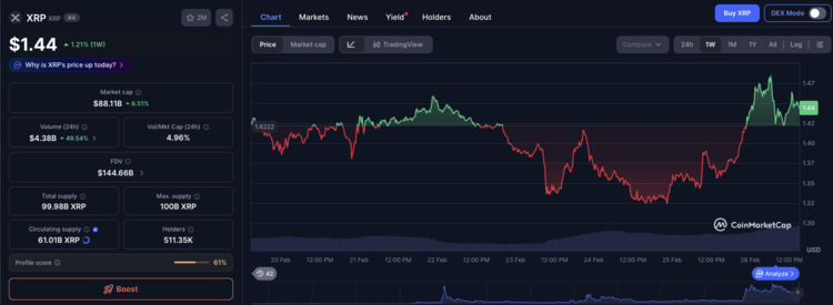 XRP stijgt vandaag naar ongeveer 1,44 dollar en noteert een winst van rond 6 procent. Bron: CoinMarketCap