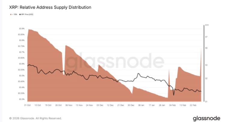 On chain gegevens laten zien dat grote wallets hun XRP bezit hebben vergroot. Adressen met meer dan 100.000 XRP hebben hun aandeel uitgebreid. Samen controleren deze wallets nu 83,7 procent van alle tokens.