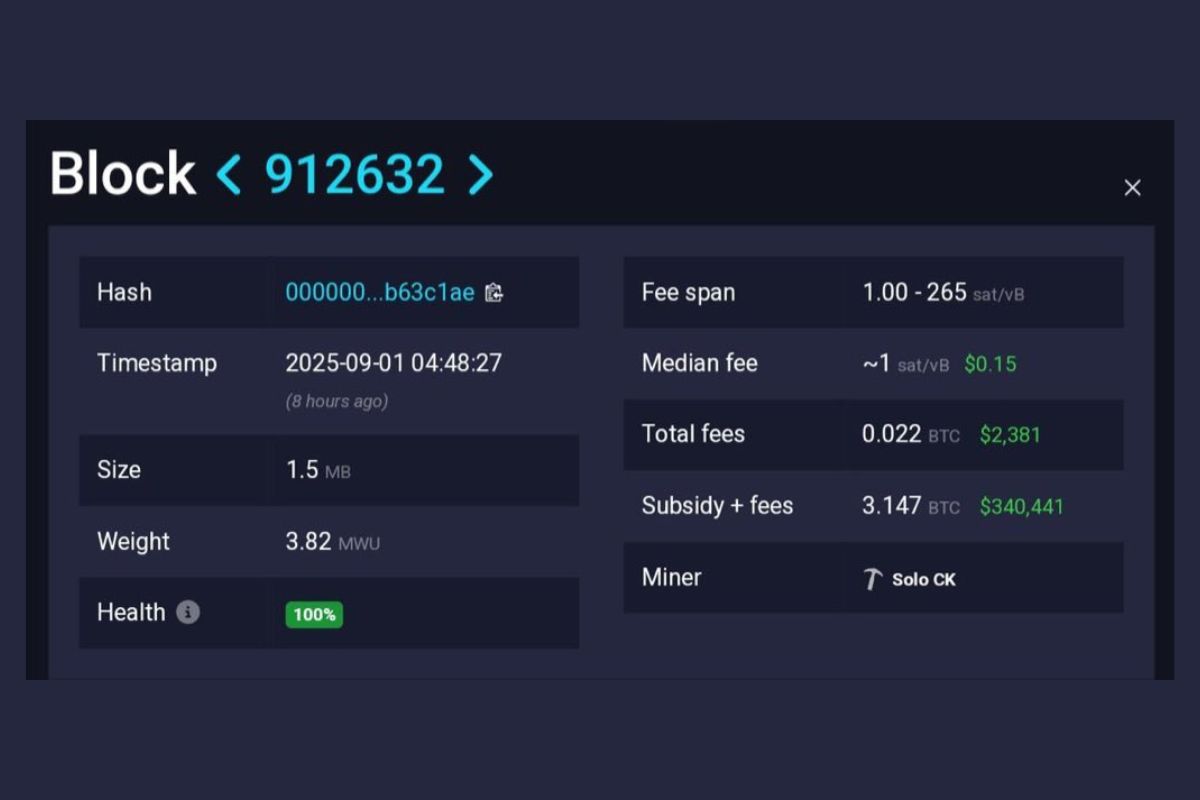 Um minerador solo conquistou o Bloco 912632 do Bitcoin, ganhando US$ 340.441 na segunda-feira (1/9).