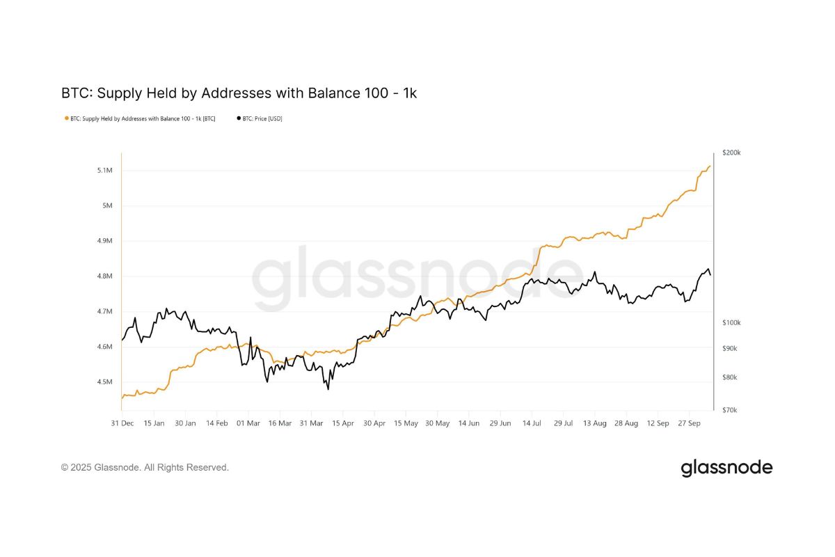 Endereços com 100 a 1.000 BTC alcançam o maior volume da história, com mais de 5,1 milhões de BTC sob custódia, segundo a Glassnode.