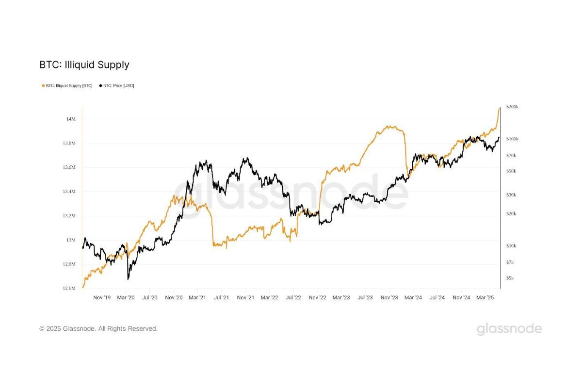 O supply ilíquido de Bitcoin atingiu um novo recorde em 2025, ultrapassando a marca de 14 milhões de BTC, segundo dados da Glassnode. Na prática, isso significa que mais de dois terços de todo o estoque existente está em carteiras com histórico de pouca ou nenhuma movimentação, comportamento típico de investidores de longo prazo.