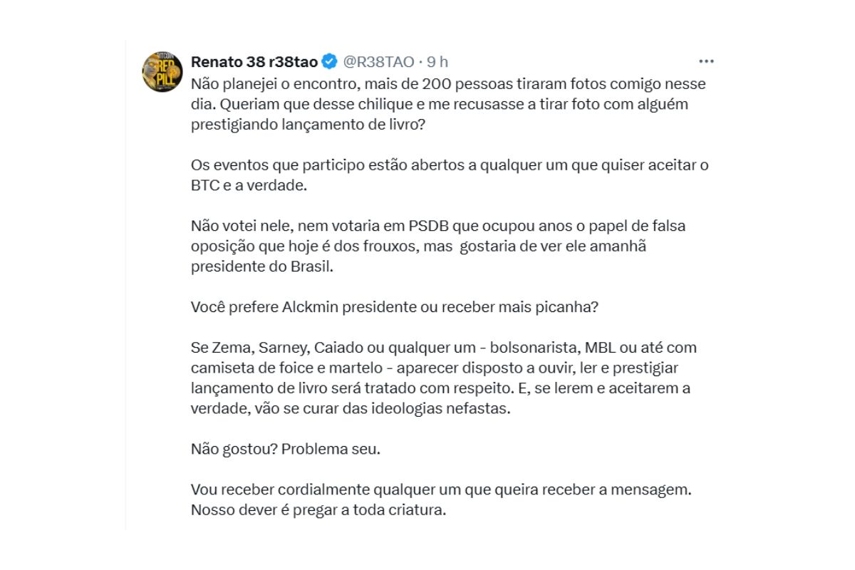 Em tom provocativo, ele afirmou que não planejou o encontro, já que mais de 200 pessoas estavam no evento e tiraram fotos com Alckmin. Segundo Renato, os eventos de que participa são abertos a todos os que aceitarem o BTC e a ‘verdade’.