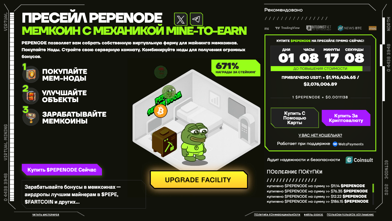 PEPENODE – это первый мемкоин, позволяющий зарабатывать на майнинге, хоть и виртуальном. Как это становится возможным? Нативный токен проекта дает пользователям доступ к игровой экосистеме, в которой они покупают серверные для добычи мемных криптовалют. Инвесторам не нужно платить за дорогостоящее оборудование и счета за электроэнергию, достаточно купить PEPENODE и майнить активы. Серверные можно продавать и улучшать, чтобы соревноваться в рейтинге лучших майнеров и получать дополнительные вознаграждения.