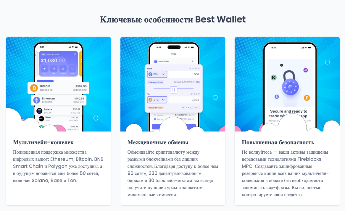 Best Wallet – это некастодиальный мультичейн-кошелек, поддерживающий более 50 блокчейнов. Пользователи оценят возможности продукта: торговля активами на DEX, выгодный обмен, операции с фиатными валютами, покупка токенов на предпродажах – все это в одном интерфейсе.