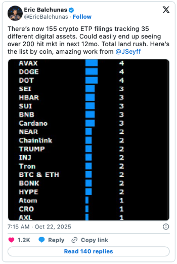 Контекст волны ETF-заявок: С 2024 года регуляторам США подано около 155 заявок на крипто-ETF, включая 23 на Bitcoin и Solana, 20 на Ripple (XRP), 16 на Ethereum и четыре на Dogecoin. Рынок ETF на криптовалюты переживает бум после одобрения первых продуктов на BTC и ETH.