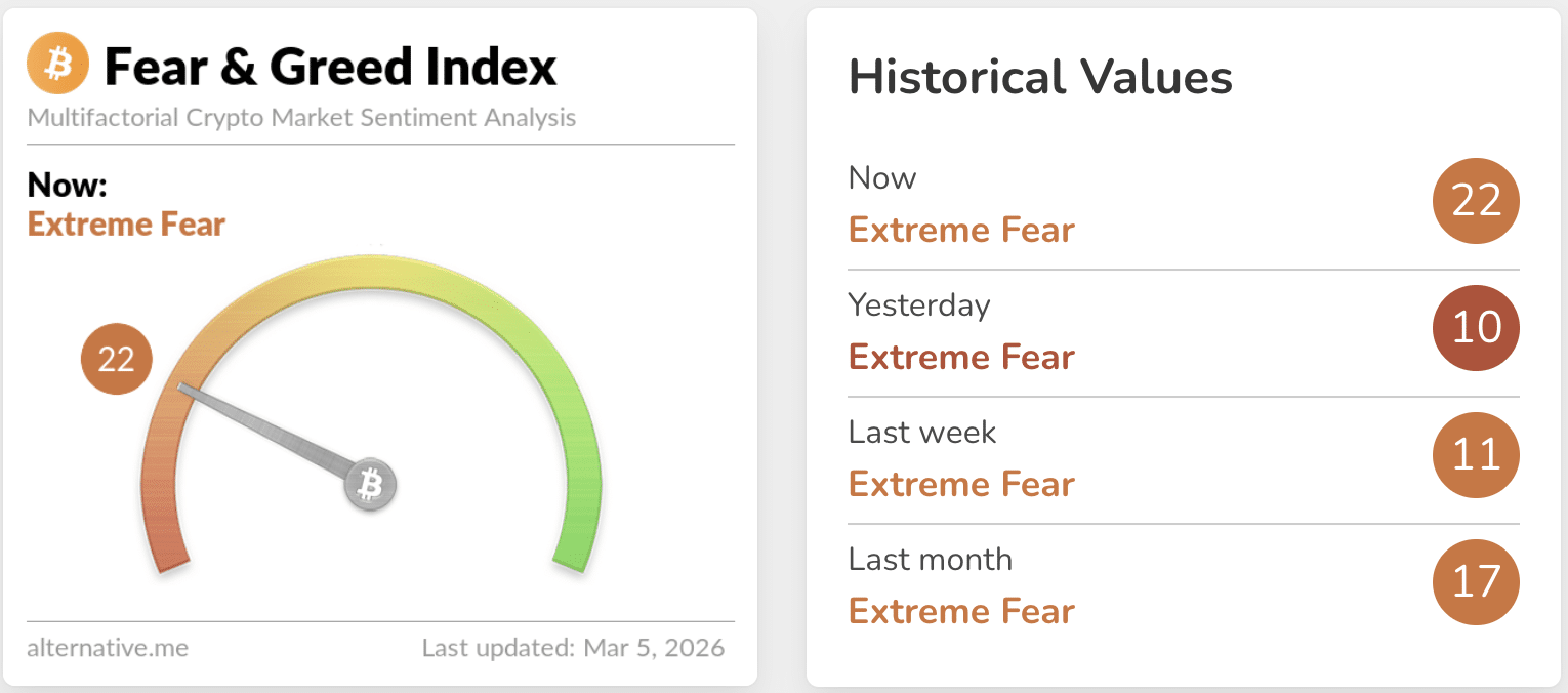Shiba Inu is hovering near $0.0000056, treading water as the broader crypto market has enjoyed a brief respite. While the Crypto Fear & Greed Index has climbed to 22/100, it still signals “Extreme Fear.”
