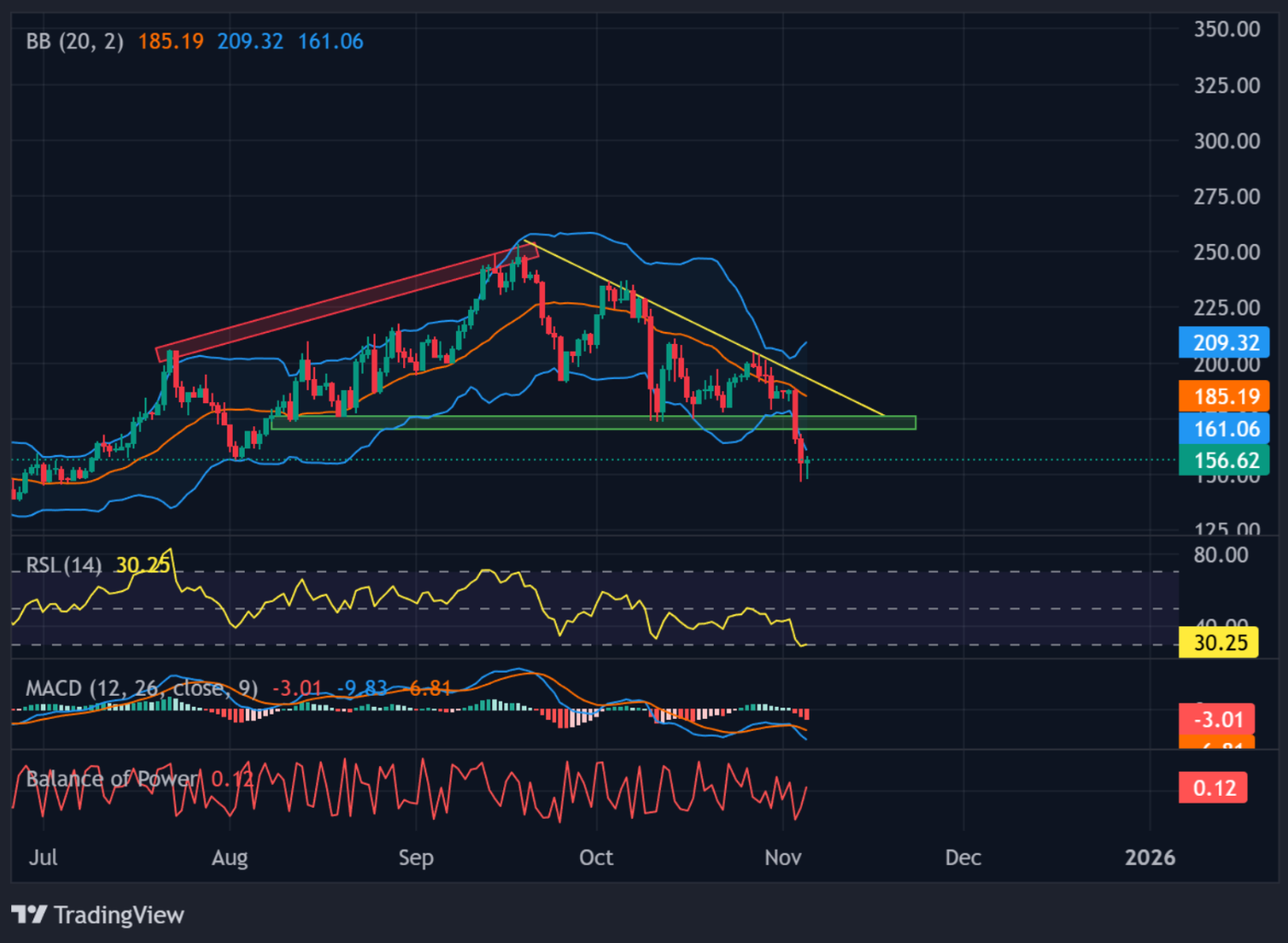 Solana SOL $156.2 24h volatility: 2.6% Market cap: $86.33 B Vol. 24h: $11.04 B slipped to its August lows around $156, following a sharp fall in its network dominance as traders rotated toward new high-activity chains like Hyperliquid and BNB Chain.