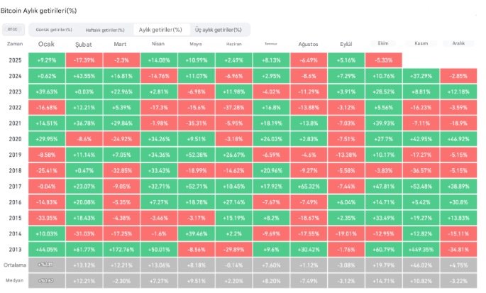 Bitcoin, ay başından beri yüzde 5 değer kaybetti. Ayrıca Pazar günü Asya saatlerinde 107.000 dolar civarında işlem görüyor. CoinGlass verileri, Ekim ayının tarihsel olarak ortalama yüzde 19,8 getiri sunduğunu gösteriyor. Buna rağmen Kasım ayı, yüzde 42 oranla varlığın en güçlü dönemi olmaya devam ediyor.