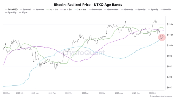 13–17 Ekim arasında spot Bitcoin ETF’lerinden 1,23 milyar dolardan fazla çıkış oldu. Bu gelişme, talebin zayıfladığını net biçimde ortaya koyuyor. CryptoQuant verileri, 3–6 aylık UTXO gerçekleşen fiyat seviyesinin yaklaşık 108.300 dolar olduğunu gösteriyor. Bu seviye, orta vadede önemli bir destek noktası oluşturuyor.