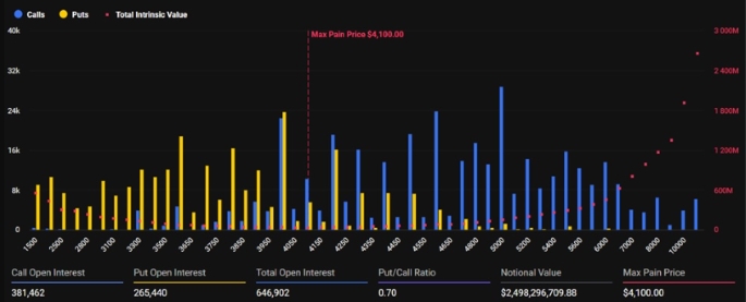 - Ethereum, 3.837 dolardan işlem görüyor ve bugün 2,49 milyar dolar değerinde 646.902 opsiyon vadesi doluyor.Bu opsiyonların maksimum acı noktası 4.100 dolar olarak hesaplandı.