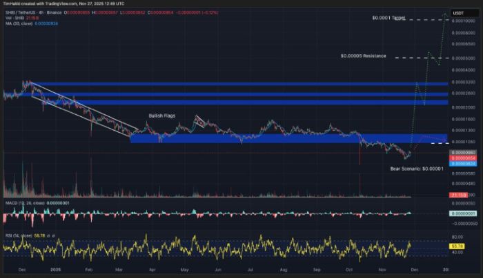 Claude AI’ye göre SHIB, kasımın kapanışında 0,000025 dolarlık kritik direnci aşmayı başarırsa yıl sonuna kadar 0,00005–0,00009 dolar aralığına ulaşabilir.