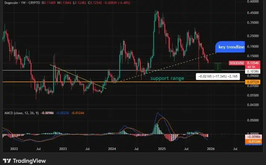 DOGE fiyatı, son yedi günde %15’ten fazla düşerek kritik bir destek trend çizgisinin altına indi. Bu durum, DOGE altcoin için orta vadeli daha fazla satış baskısının sinyalini veriyor.