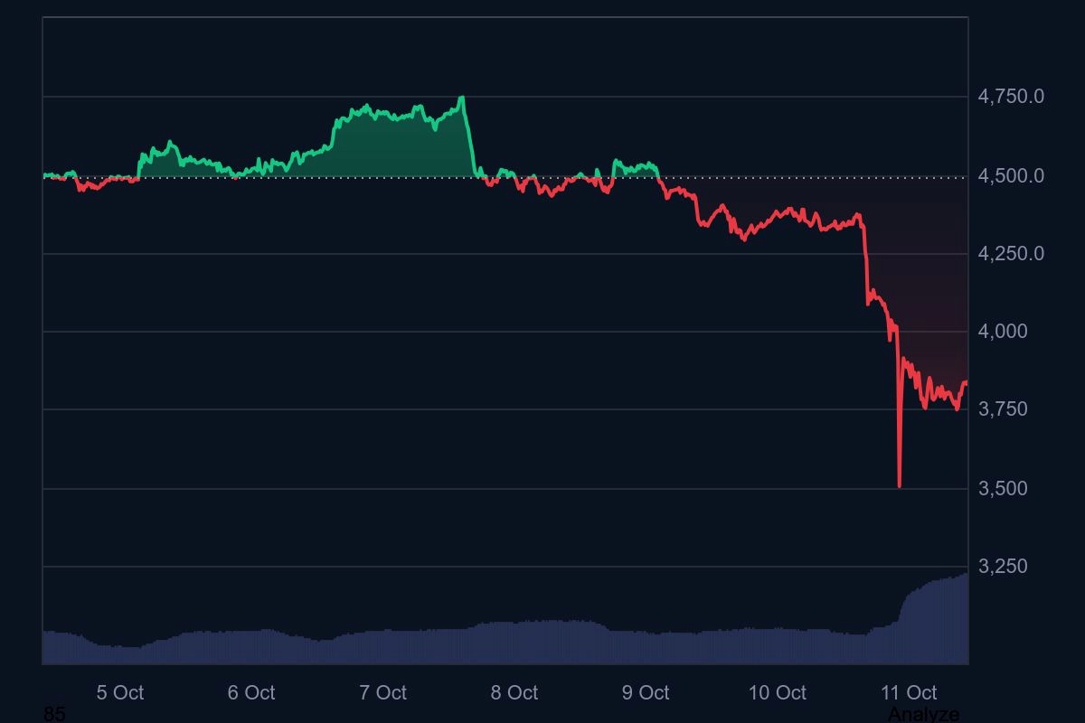 Gün içinde %12’den fazla değer kaybederek 2023’ün en sert günlük düşüşlerinden birini yaşayan Ethereum, kısa vadede 3.836–3.850 dolar aralığında istikrar kazandı.