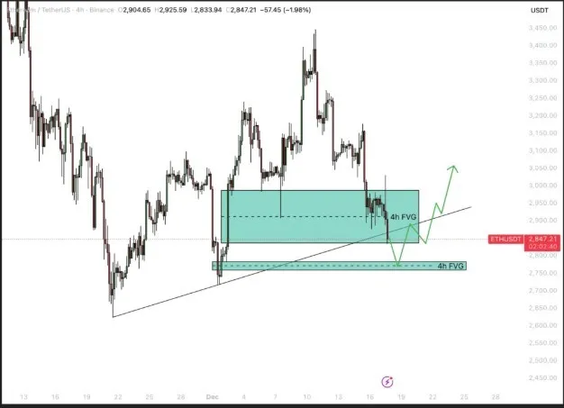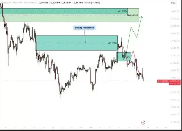 Geçtiğimiz hafta, ETH’nin büyük bir düşüş eğilimli 4 saatlik FVG (Fair Value Gap) seviyesindeydi. Bu seviyenin kırılması durumunda günlük düşüş eğilimli FVG’ye doğru bir yükseliş bekleniyordu. Ancak gerçekler biraz daha acımasız çıktı.