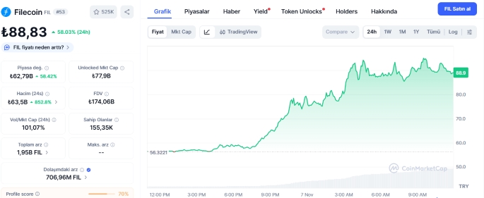 Şu anda Filecoin 2,15 dolar civarında işlem görüyor. Son 24 saatte yüzde 59 yükselen tokenın piyasa değeri 1,52 milyar dolara ulaştı.