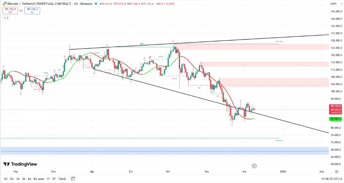Bitcoin, günlük grafikte uzun süredir süren bir düzeltme yapısını koruyor. Ayrıca Bitcoin canlı fiyat verileri şu anda yaklaşık 90 bin dolar bölgesinde yatay seyir gösteriyor.