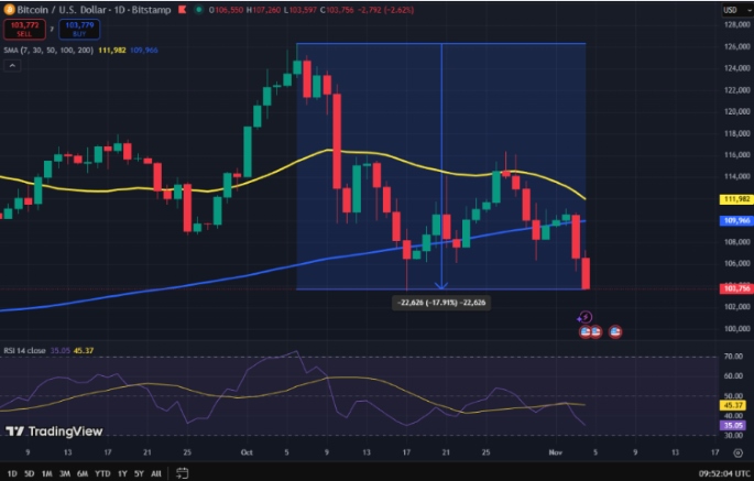 Bitcoin, ekim başındaki 126 bin dolarlık zirveden bu yana yaklaşık yüzde 18 kaybetti. Ayrıca nisan ayından beri ilk kez 200 günlük ortalamasının (mavi) altına indi. Bu durum, bazılarına göre yeni bir ayı piyasasının başlangıcı olabilir. Bu nedenle BTC’nin önümüzdeki günlerde 100 bin doların altına inmesi mümkündür.