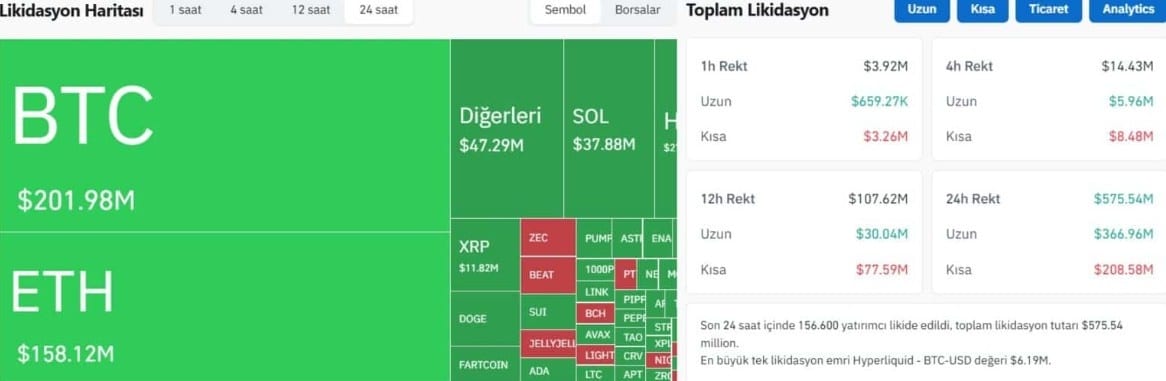 Süreçte yaklaşık 576 milyon dolarlık kaldıraçlı pozisyon tasfiye edildi ve satış baskısı altcoinlere de yayıldı.