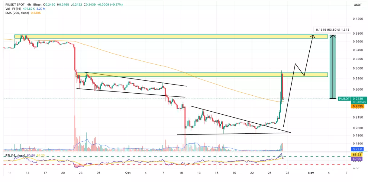 Pi, bir gecede %30 artışla 0,29 dolara yükseldi ve işlem hacimleri son 24 saatte %1150 patlayarak yükseliş yönlü bir Pi Coin fiyat tahminini destekledi.