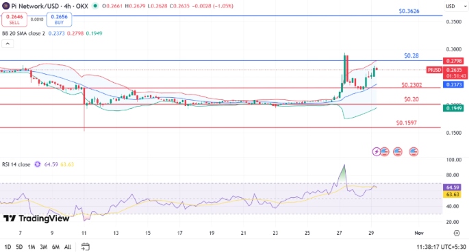 Teknik tarafta, Pi Network fiyatı bir haftadır dar bir aralıkta hareket ediyor. Fiyat, 0,23 dolarlık destek ile 0,28 dolarlık direnç arasında sıkışık kaldı. Ancak ISO 20022 haberi geldiğinde, alıcılar hızlı biçimde piyasaya girdi. Böylece 0,28 dolardaki satış duvarını aşarak fiyatı yeni zirvelere taşıdılar.