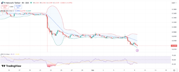 4 saatlik grafikte PI, orta Bollinger Bantlarının altında işlem görüyor. Bu, satış baskısının sürdüğünü gösteriyor. Düşüş devam ederse, traderlar 0,226 dolar seviyesinde destek görebilir. Daha güçlü bir taban ise 0,215 dolar civarında oluşabilir.