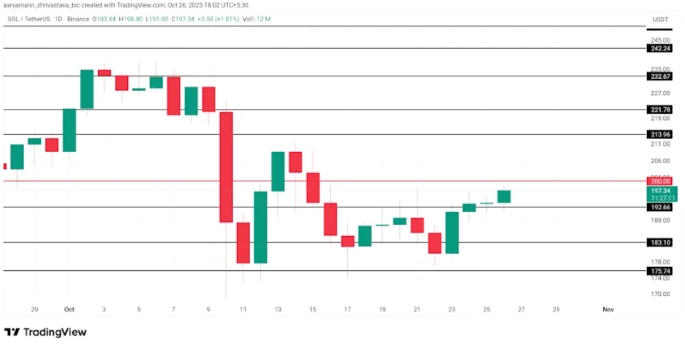 Yazı yazıldığı sırada Solana, 197 dolardan işlem görüyor. Fiyat, 200 dolar direncinin hemen altında yer alıyor. Bu seviye, sürekli bir engel oluşturarak kalıcı toparlanmayı önledi.