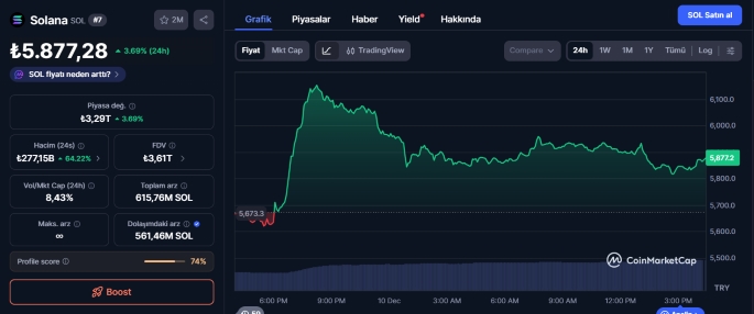 Solana haftaya kurumsal ETF duyurusu ve SKR airdrop beklentisiyle güçlenerek 5.877 TL seviyesinde pozitif görünüm koruyor. Hacimdeki artış ve ekosistem genişleme hamleleri, kısa vadede fiyat ivmesini destekliyor.